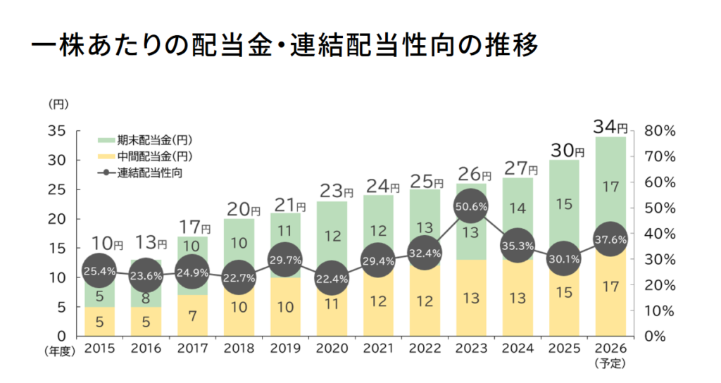 配当性向も約30%で推移しており、無理なく安定して配当を出しています。